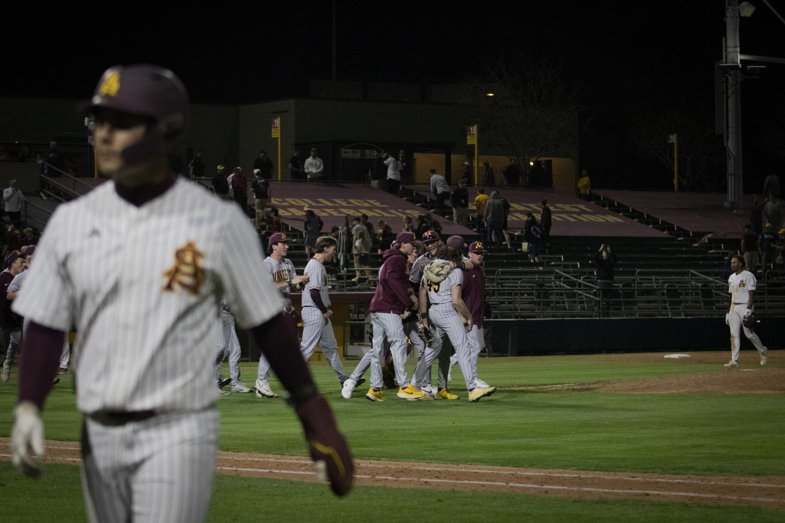 It wasn’t until Minnesota turned to its bullpen at the start of the seventh inning that the offense regained its momentum from the early game. ASU led off by loading the bases with no one out then scored two quick runs off a four-pitch walk to Vu and a RBI single from sophomore left fielder Brandon Compton. Now down just one run and the bases still loaded with no outs, senior first baseman Jacob Tobias hitting into a double play meant the Sun Devils were only able to squeeze out the equalizing score.
